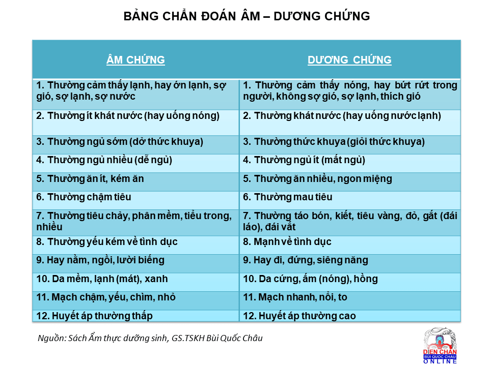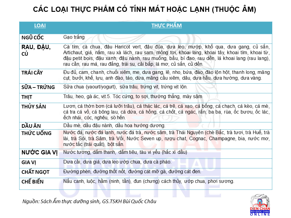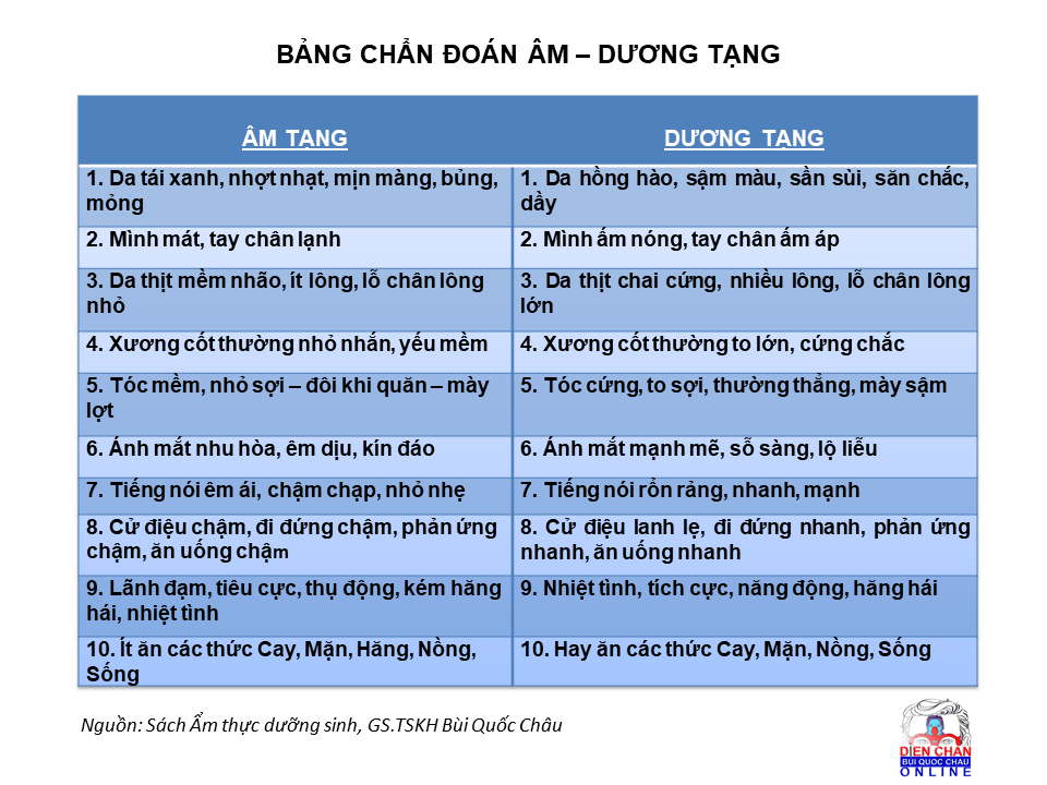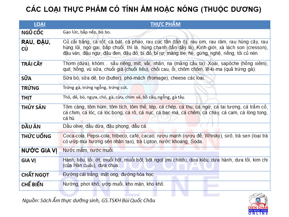Tuy nhiên căn cứ vào bảng phân dưới đây, các bạn cũng sẽ biết mình thuộc tạng (bệnh) nào và biết được thức ăn, thức uống nào mát, lạnh (hàn) hay ấm, nóng (nhiệt) để từ đó chọn thức ăn thích hợp với cơ thể mình lúc ăn uống ngỏ hầu bảo vệ được sức khỏe (Ẩm Thực Dưỡng Sinh).
